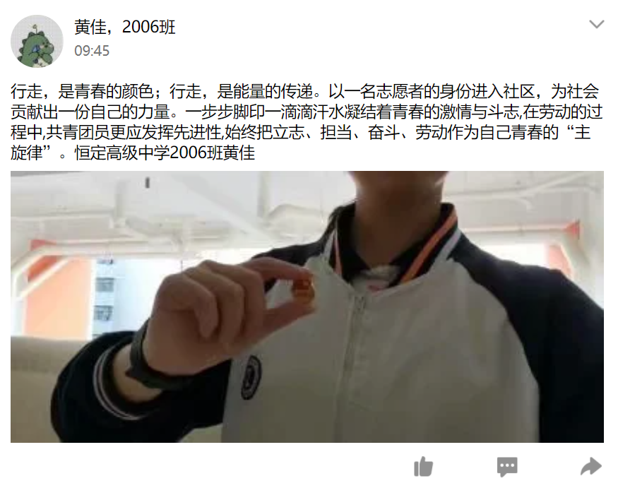 “行走的团徽”主题实践活动是要求全校共青团员在“五一”、“五四”期间外出参加红色研学活动、社会实践活动、志愿服务活动时要佩戴好团徽,亮出身份、增强认同,同时拍摄与徽章的合影,并结合自身经历和体会,写下对行走的理解感悟以及意义诠释。