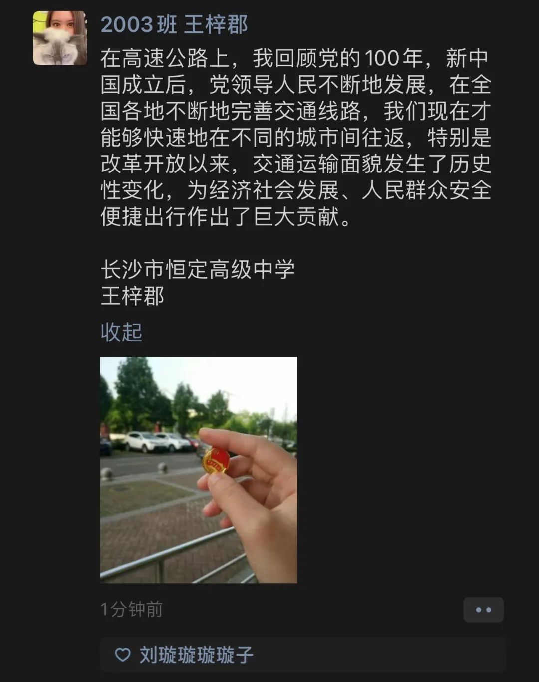 今年是中国共产党成立 100 周年,为落实《共青团中央关于在全团开展“学党史、强信念、跟党走”学习教育的通知》相关要求,为积极响应共青团长沙市教育局委员会关于“行走的团徽”主题教育实践活动的号召,引导广大师生全面认知历史、深化理性认同、不畏风险挑战、勇担强国使命,我校团委利用“五一”、“五四”假期开展“行走的团徽”主题实践活动。